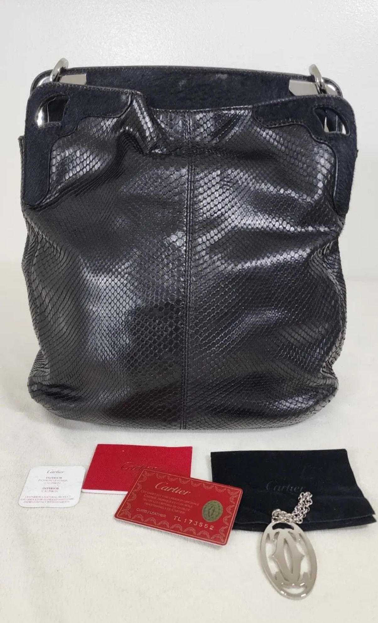 This Cartier masterpiece features smooth black Python leather with cowhide trimmings and silver hardware, combining elegance with edge. The soft top edge allows for easy closing with a magnetic clasp, while the adjustable strap conforms to your body and expands with your belongings.
