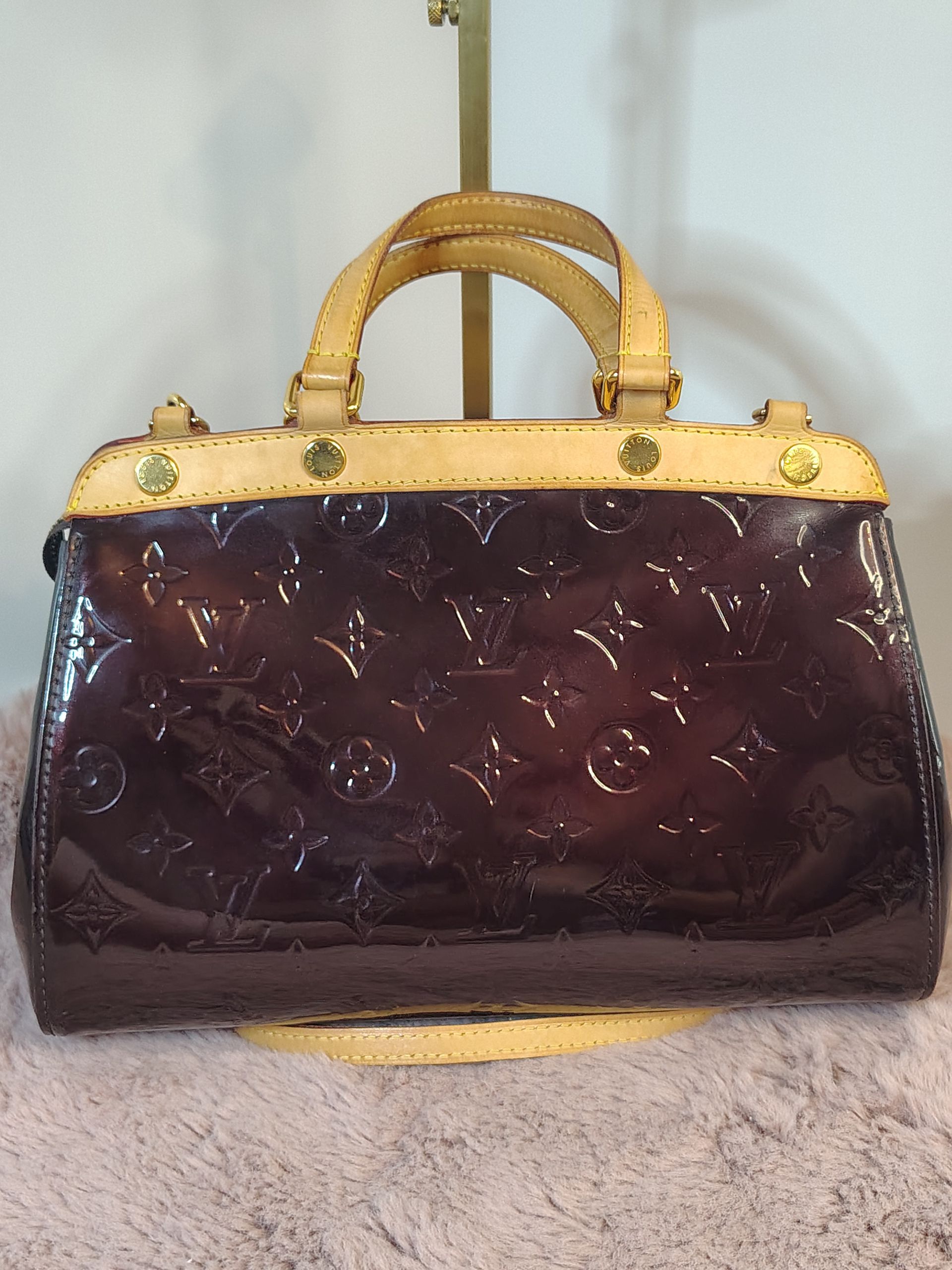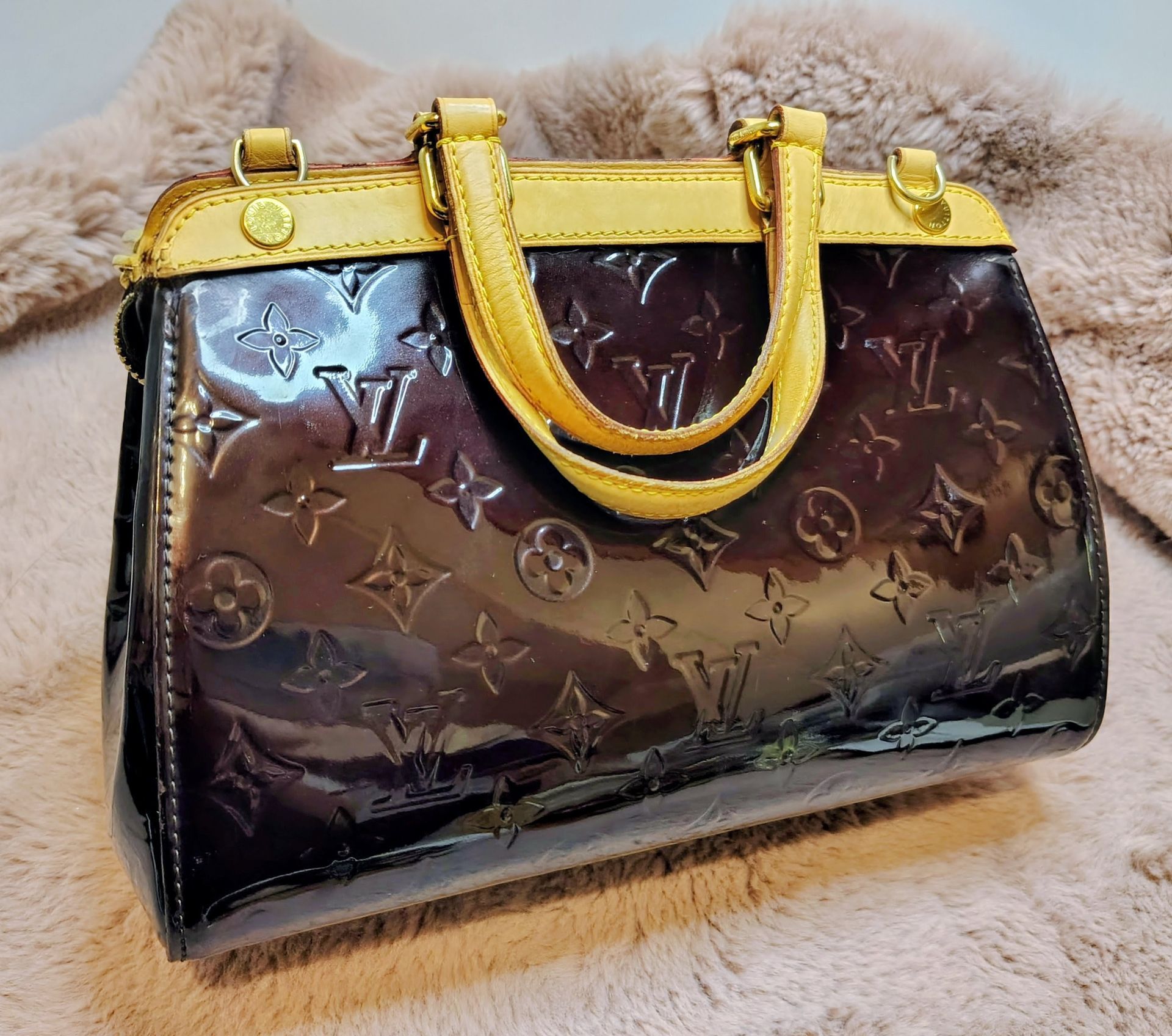 A chic and sophisticated everyday Louis Vuitton bag to carry all your daily essentials in the very hard to source color "Amarante". This Louis Vuitton Monogram Vernis Brea MM Bag is the medium version of the Brea collection and is a feminine and modern interpretation of the classic Doctor's bag. It features top handles for handheld use and several pockets inside for plenty of storage. Perfect for everyday use. Please note this bag was purchased in 2012 for $2190. Current retail price is $2730.