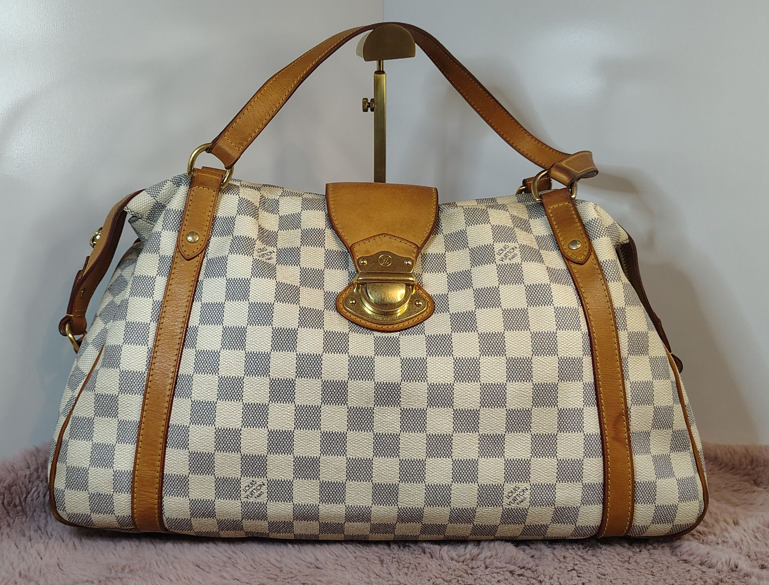This Louis Vuitton Damier Azur Stresa GM shoulder bag features a beige and white design crafted from durable canvas, Golden Honey patina vachetta leather and gold-toned hardware. It measures 27cm in height, 38cm in width, and 14.5cm in depth. This item originates from France and is designed for women, making it a stylish accessory for various occasions.